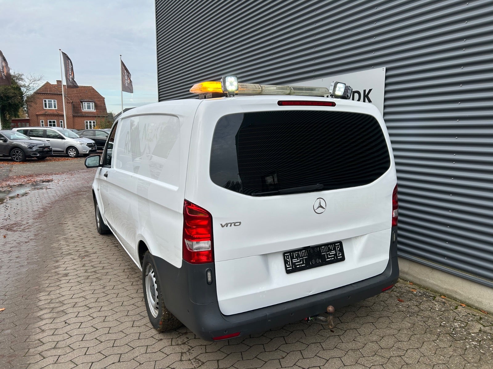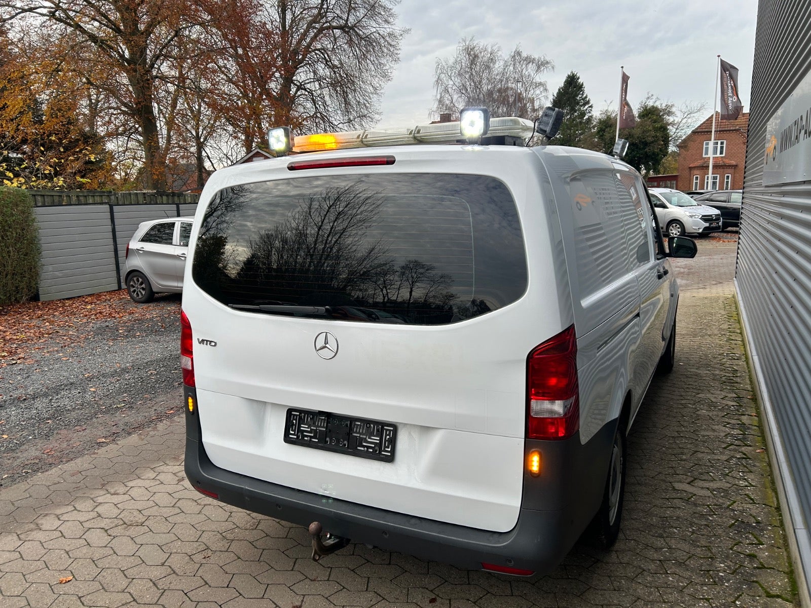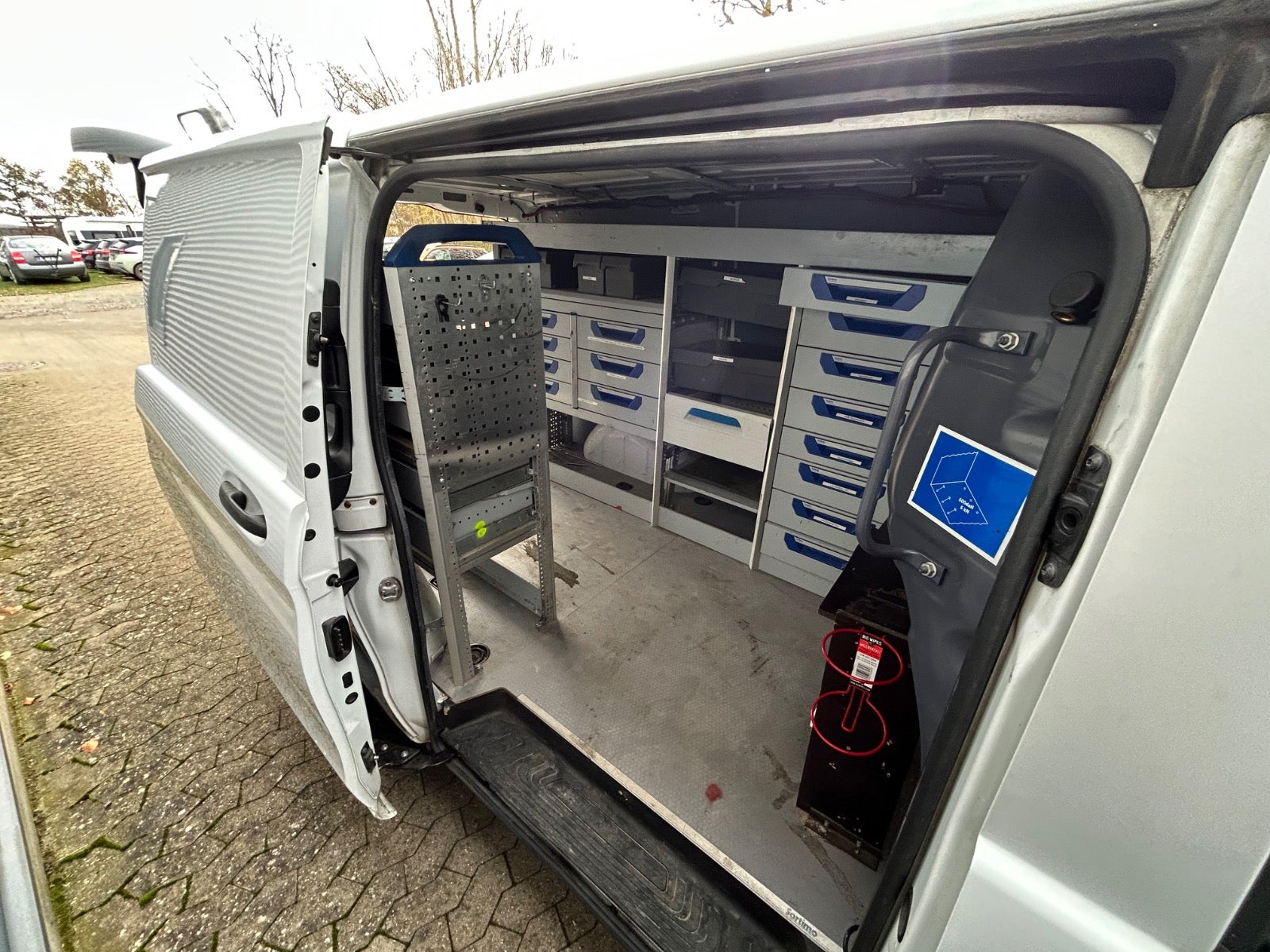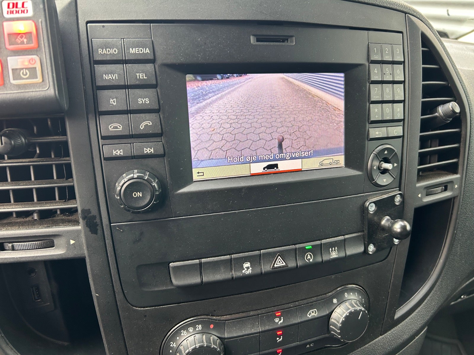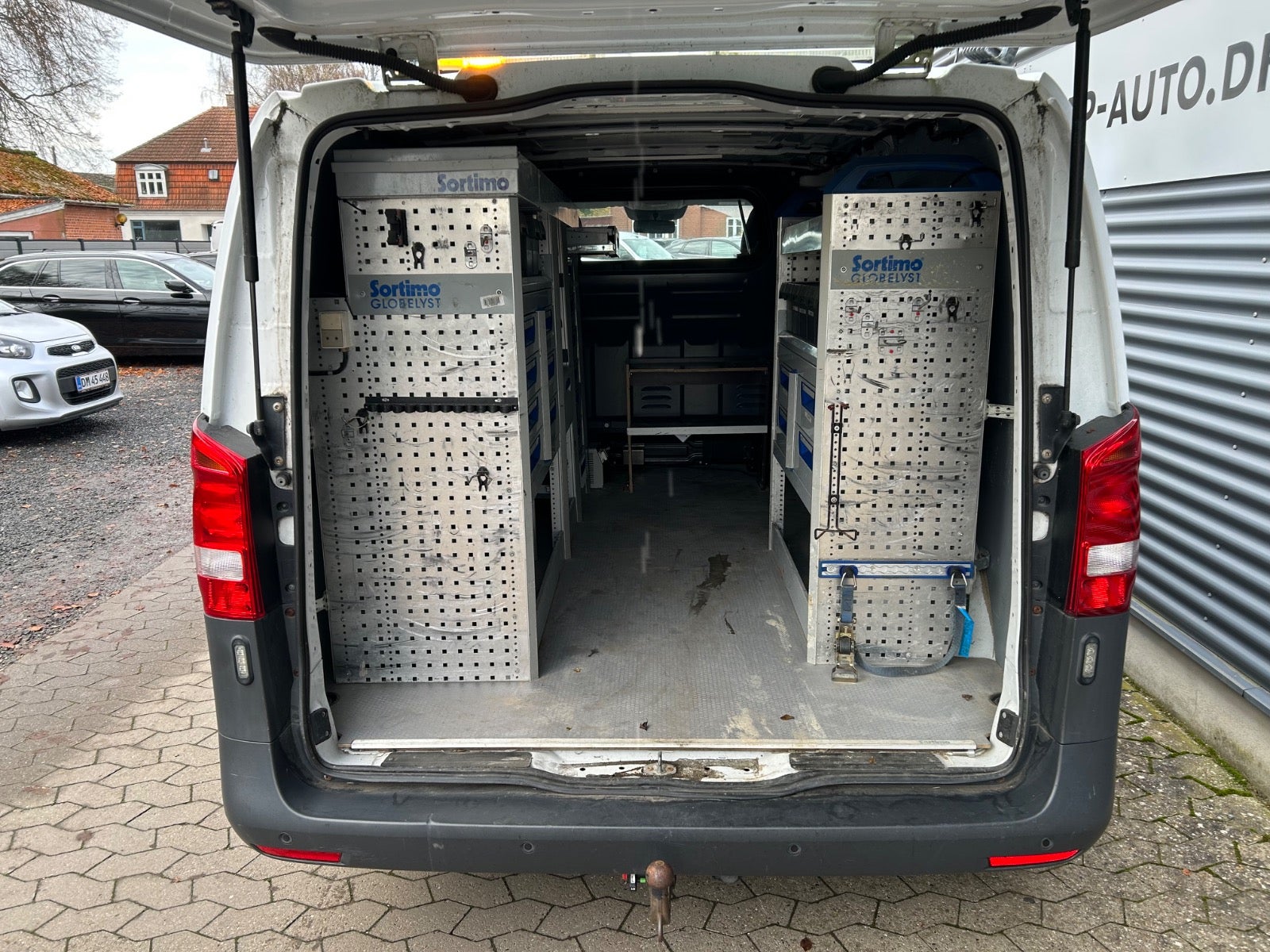 Komplet Sortimo opbygning i varerum - lige klar til opgaverne. Komplet belysningspakke med blink for-bag - samt lygtebro Super godt udstyret Vito - bakkamera - træktøj- lane assist - aircondition - bluetooth mm. Opvarmet forrude, kørecomputer, læderrat, fartpilot, fjernb. centrallås, el-ruder, bakkamera, parkeringssensor (for), parkeringssensor (bag), esp, sædevarmeBemærk det flotte km Se billeder for stand og udstyr